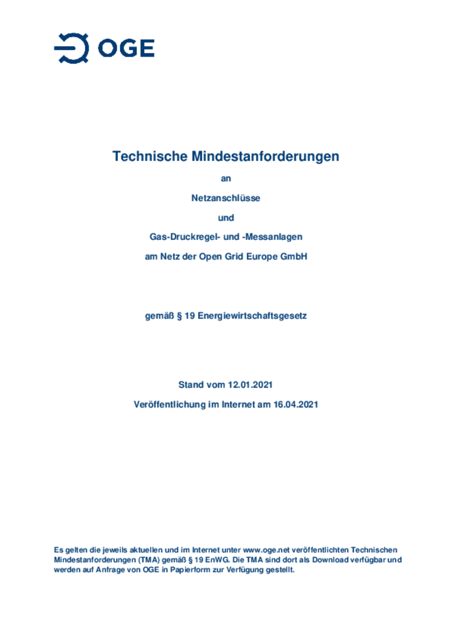 Vom 01.03.2021 bis 31.03.2021 stellt Open Grid Europe GmbH (OGE) eine überarbeitete Fassung der „Technischen Mindestanforderungen an Netzanschlüsse und Gas-Druckregel- und -Messanlagen am Netz der …Open Grid Europe GmbH“ (TMA) zur Konsultation. (Vergleichsversion)