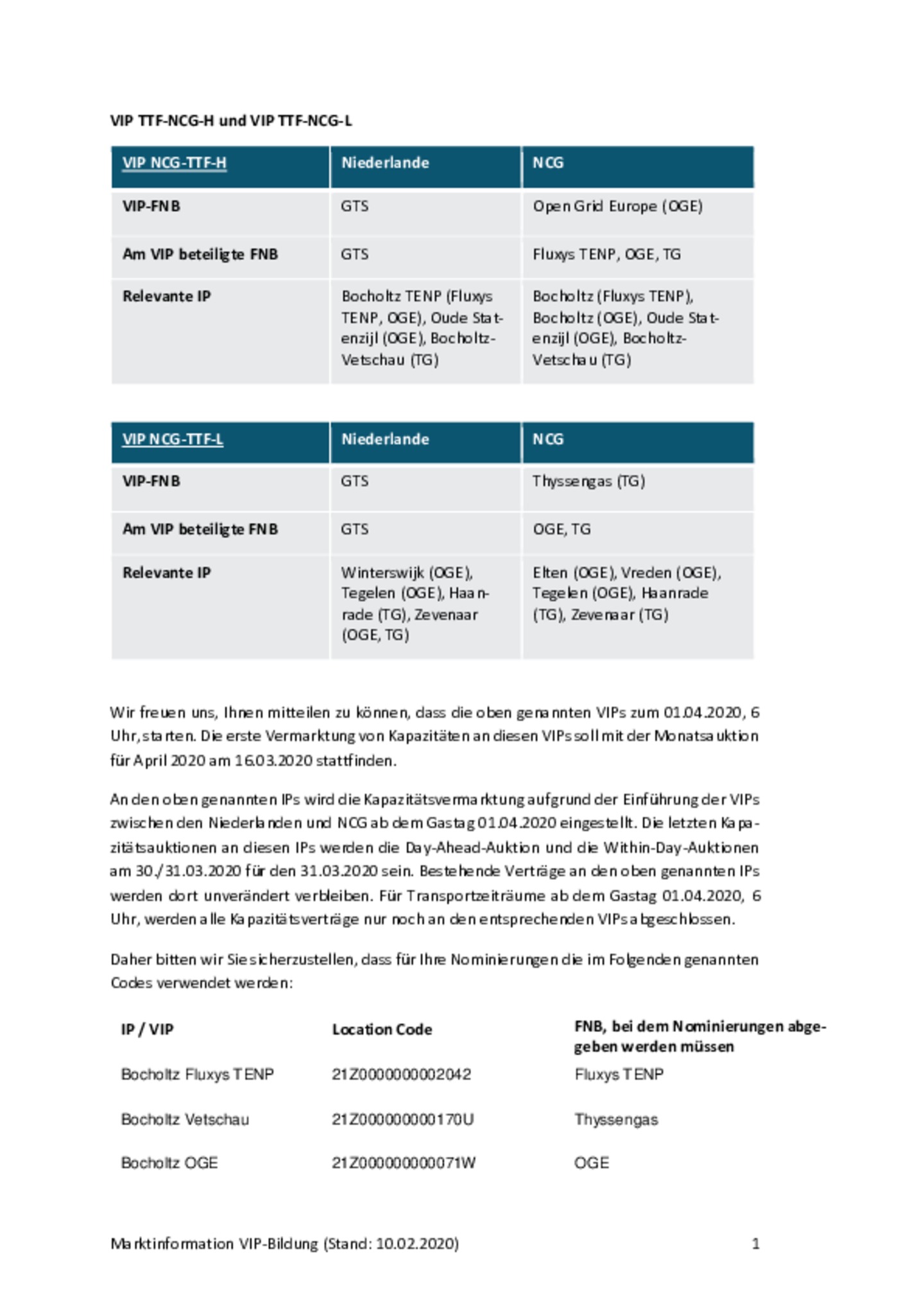 An den oben genannten IPs wird die Kapazitätsvermarktung aufgrund der Einführung der VIPs zwischen den Niederlanden und NCG ab dem Gastag 01.04.2020 eingestellt. Die letzten Kapazitätsauktionen an diesen IPs werden die Day-Ahead-Auktion und die Within-Day-Auktionen am 30./31.03.2020 für den 31.03.2020 sein. Bestehende Verträge an den oben genannten IPs werden dort unverändert verbleiben. Für Transportzeiträume ab dem Gastag 01.04.2020, 6 Uhr, werden alle Kapazitätsverträge nur noch an den entsprechenden VIPs abgeschlossen.