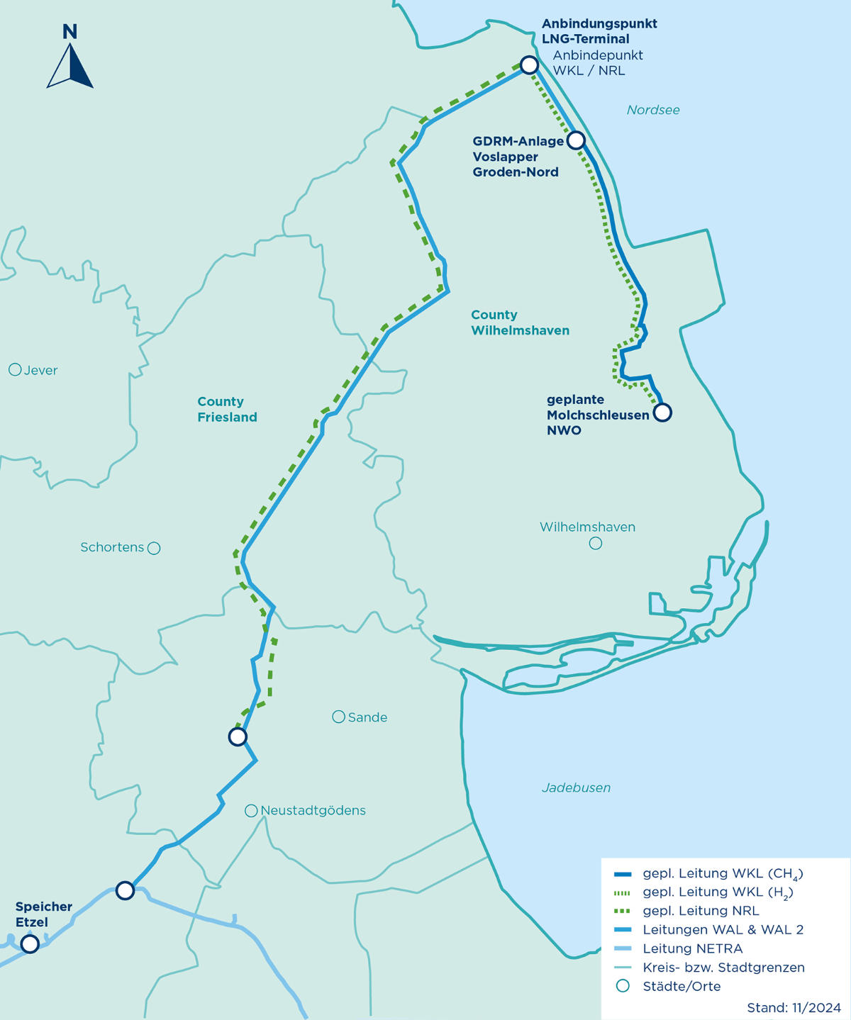 Das Wasserstoff-Kernnetz gibt für die Wilhelmshaven-Küstenlinie (H₂-Leitung) eine Fertigstellung und Inbetriebnahme Ende 2027 vor.