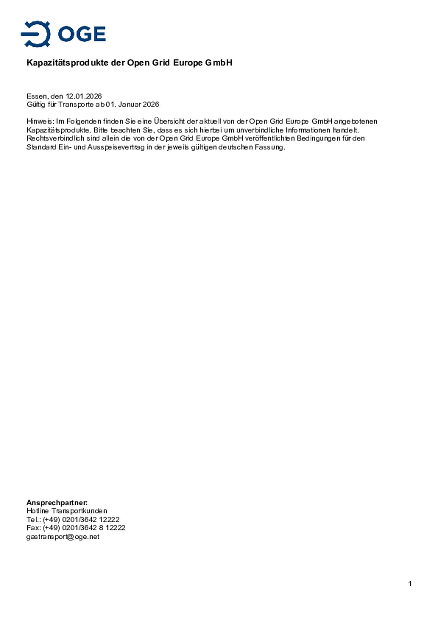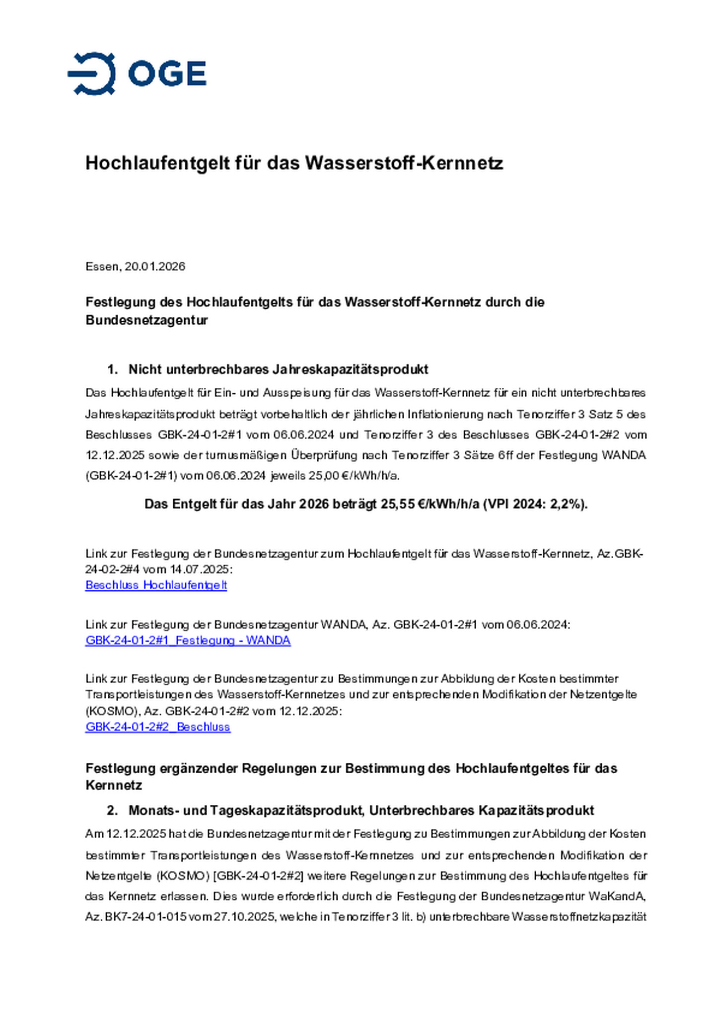 Dieses Preisblatt ist Bestandteil der Geschäftsbedingungen für den Ein- und Ausspeisevertrag zum Transport von Wasserstoff im netzbetreiberübergreifenden Wasserstoffnetz GET H2 in der …jeweils gültigen Fassung (AGB). Gültig für Transporte ab der Inbetriebnahme eines ersten Teils des Wasserstoffnetzes GET H2 durch die Open Grid Europe GmbH (voraussichtlich im 1. Quartal 2026). Stand 20. Januar 2026