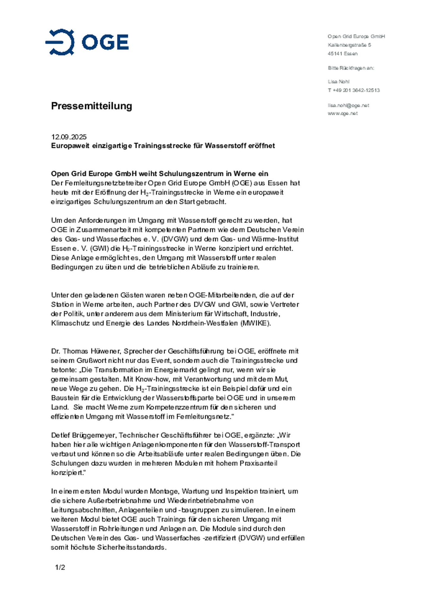 Open Grid Europe GmbH weiht Schulungszentrum in Werne ein. Der Fernleitungsnetzbetreiber Open Grid Europe GmbH (OGE) aus Essen hat heute mit der Eröffnung der H₂-Trainingsstrecke in Werne ein …europaweit einzigartiges Schulungszentrum an den Start gebracht.