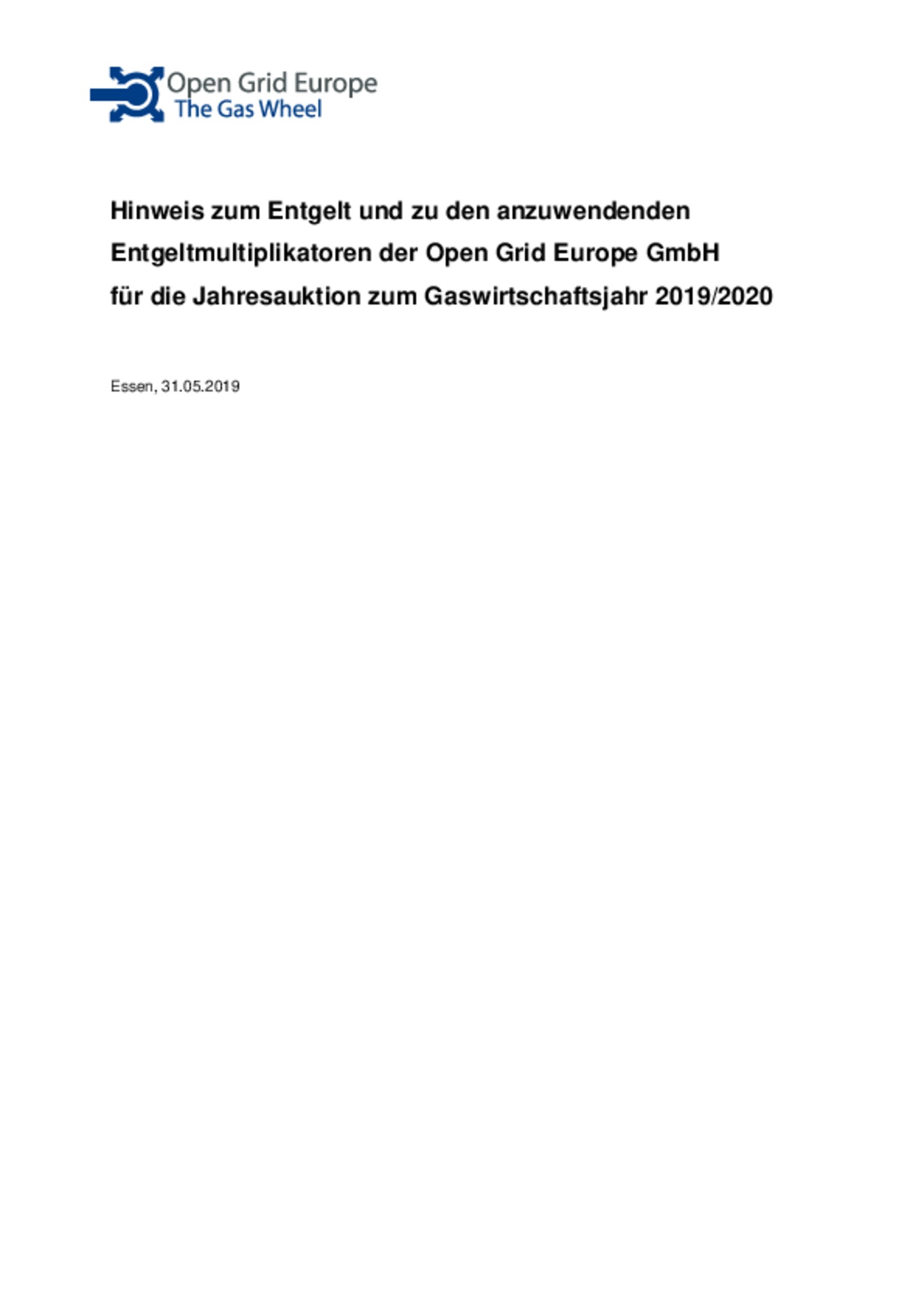 Ergänzung zum am 28.09.2018 veröffentlichten Preisblatt der Open Grid Europe GmbH für Ein- und Ausspeiseverträge sowie interne Bestellungen gem. Kooperationsvereinbarung X im Marktgebiet der NetConnect Germany GmbH & Co. KG (Preisblatt 2019)