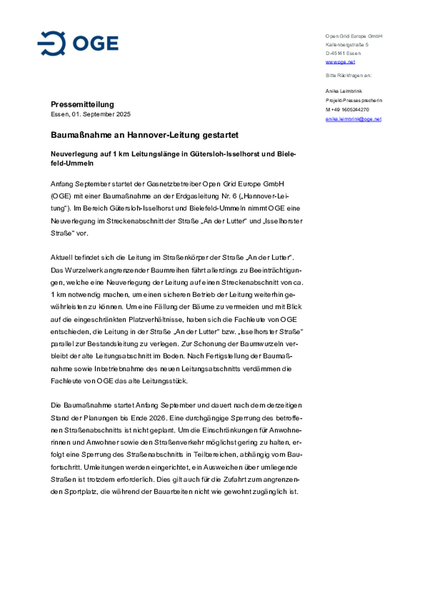 Neuverlegung auf 1 km Leitungslänge in Gütersloh-Isselhorst und Bielefeld-Ummeln