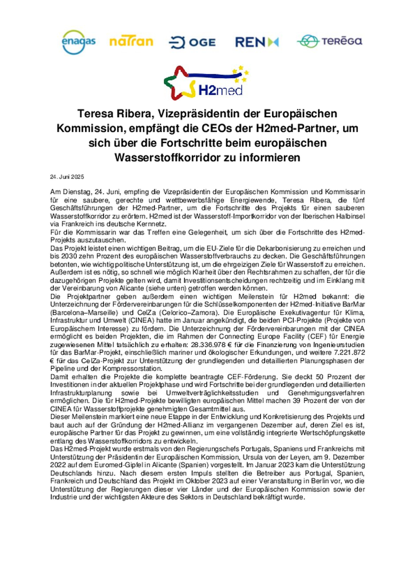 Am Dienstag, 24. Juni, empfing die Vizepräsidentin der Europäischen Kommission und Kommissarin für eine saubere, gerechte und wettbewerbsfähige Energiewende, Teresa Ribera, die fünf Geschäftsführungen der H2med-Partner, um die Fortschritte des Projekts für einen sauberen Wasserstoffkorridor zu erörtern. H2med ist der Wasserstoff-Importkorridor von der Iberischen Halbinsel via Frankreich ins deutsche Kernnetz.
