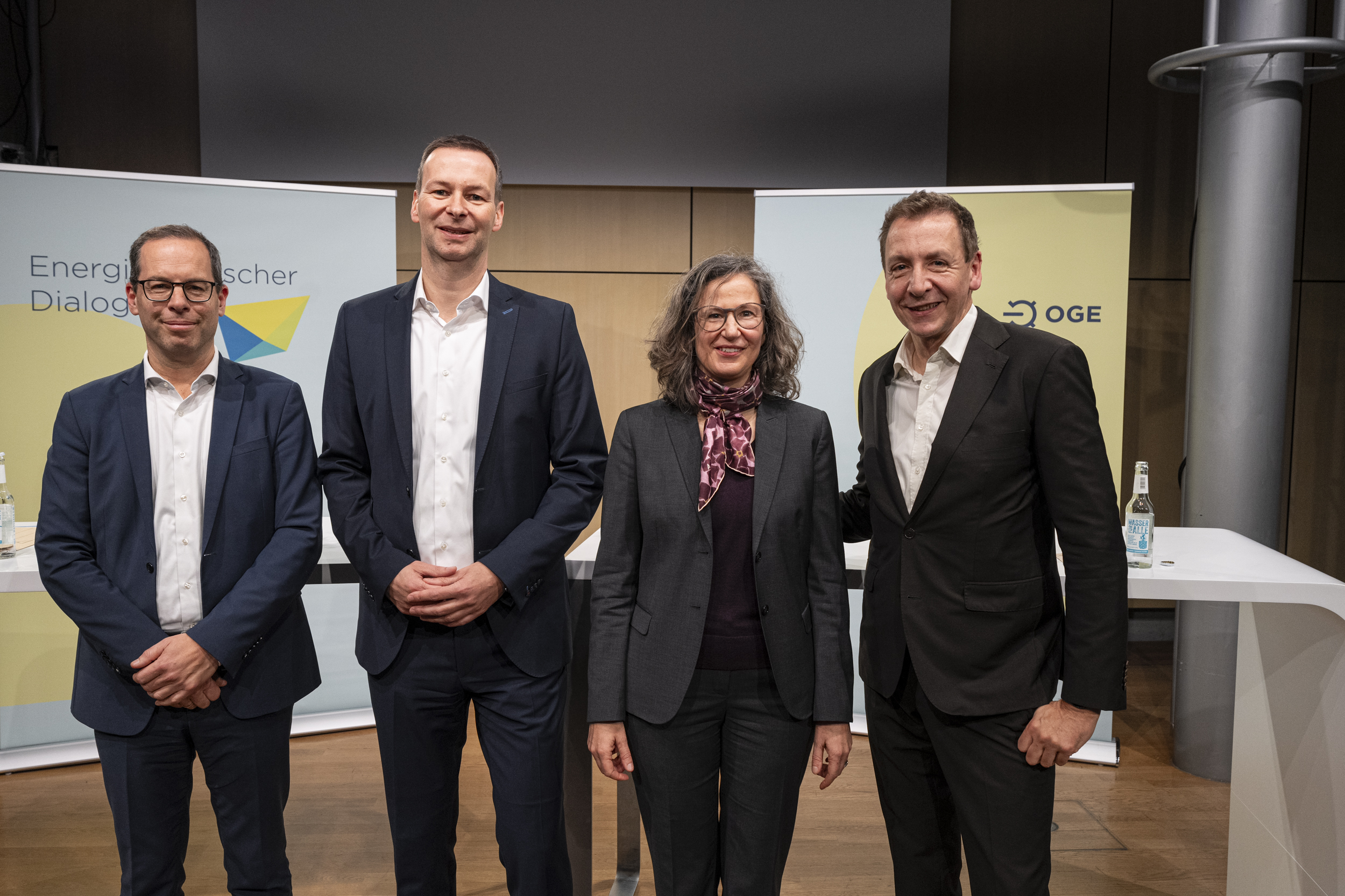 Zu den hochkarätigen Diskutanten auf dem Podium in Berlin gehörten Dr. Alexander Lücke, Unterabteilungsleiter Nationale Wirtschaftssicherheit; Energiesicherheit; Erdgas und LNG im Bundesministerium für Wirtschaft und Energie, Dr. Kirsten Westphal, Mitglied der Hauptgeschäftsführung des Bundesverbandes der Energie- und Wasserwirtschaft e. V. sowie Dr. Thomas Hüwener, Sprecher der Geschäftsführung des Gastgebers OGE. Moderiert wurde die anschließende Diskussionsrunde von Marco Seiffert.