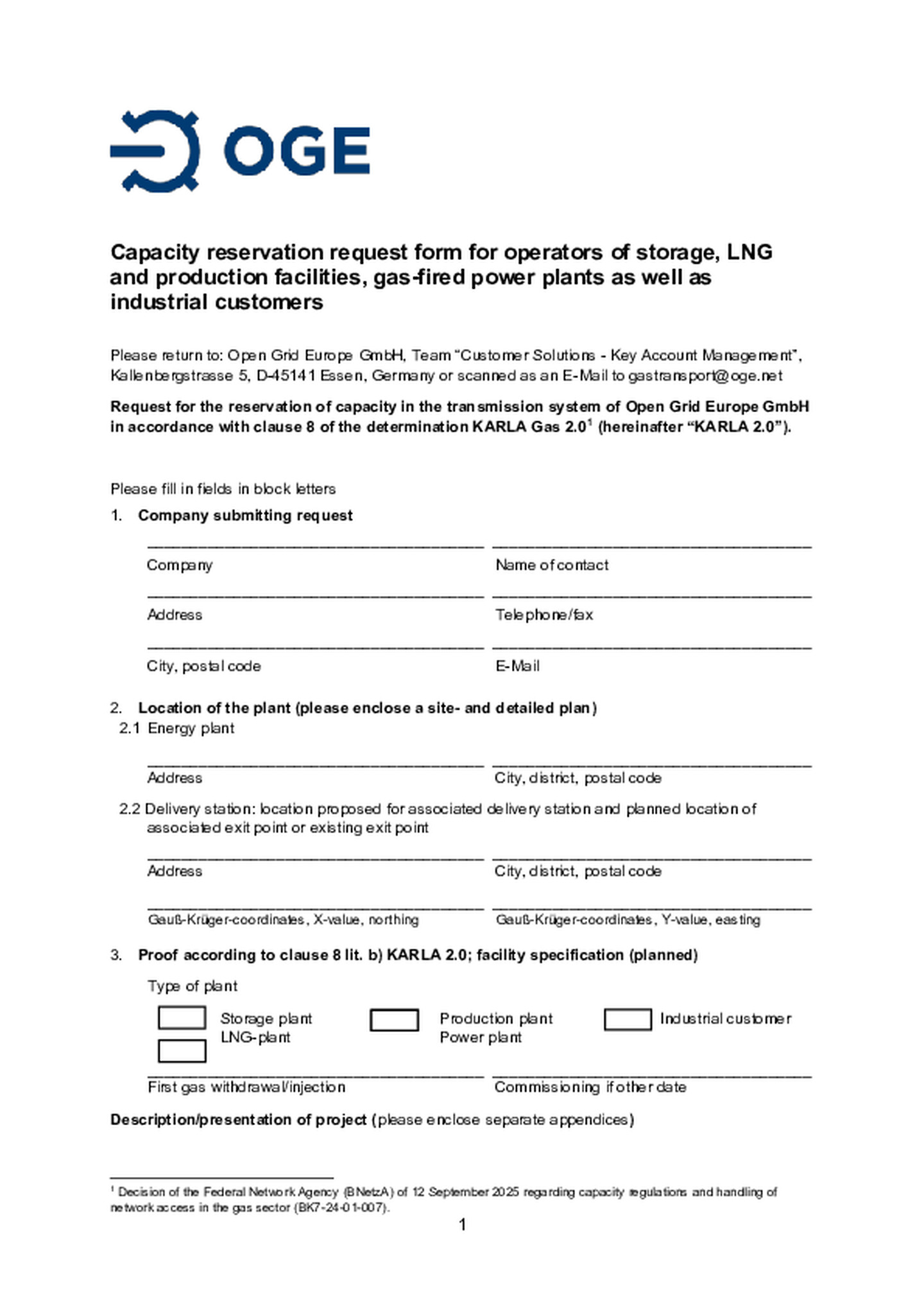 Open Grid Europe offers its shippers a form for the efficient handling of enquiries pursuant to clause 8 of the determination KARLA Gas 2.0. The use of the form is intended to ensure that Open Grid Europe promptly obtains all information required to process your enquiry efficiently.