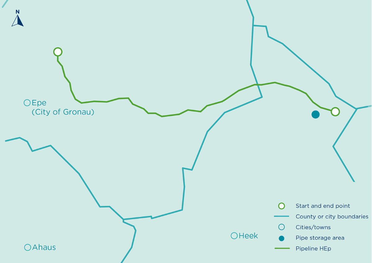 The HEp pipeline runs from Heek to Epe in the district of Borken, connecting the underground hydrogen storage facilities in Epe with the GET H2 network. The partners in this project are Open Grid Europe GmbH (50 per cent) and Nowega GmbH (50 per cent).