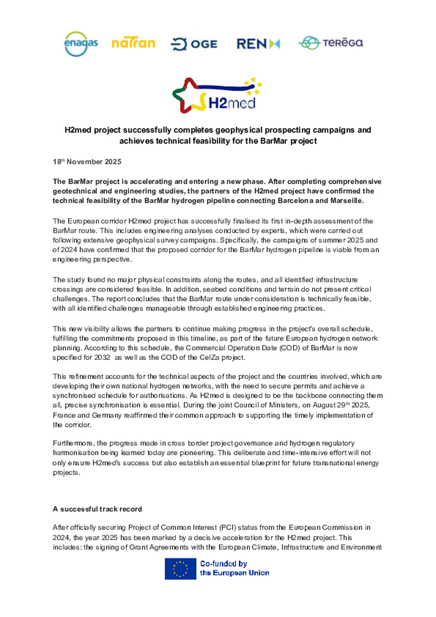 The BarMar project is accelerating and entering a new phase. After completing comprehensive geotechnical and engineering studies, the partners of the H2med project have confirmed the technical …feasibility of the BarMar hydrogen pipeline connecting Barcelona and Marseille.