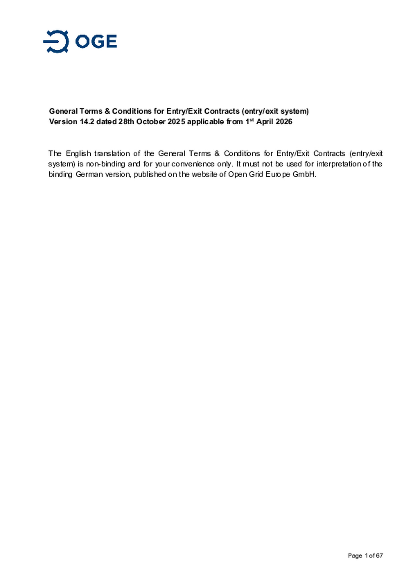 General Terms & Conditions for Entry/Exit Contracts (entry/exit system) version 14.2 (28.10.2025), applicable from 1st April 2026