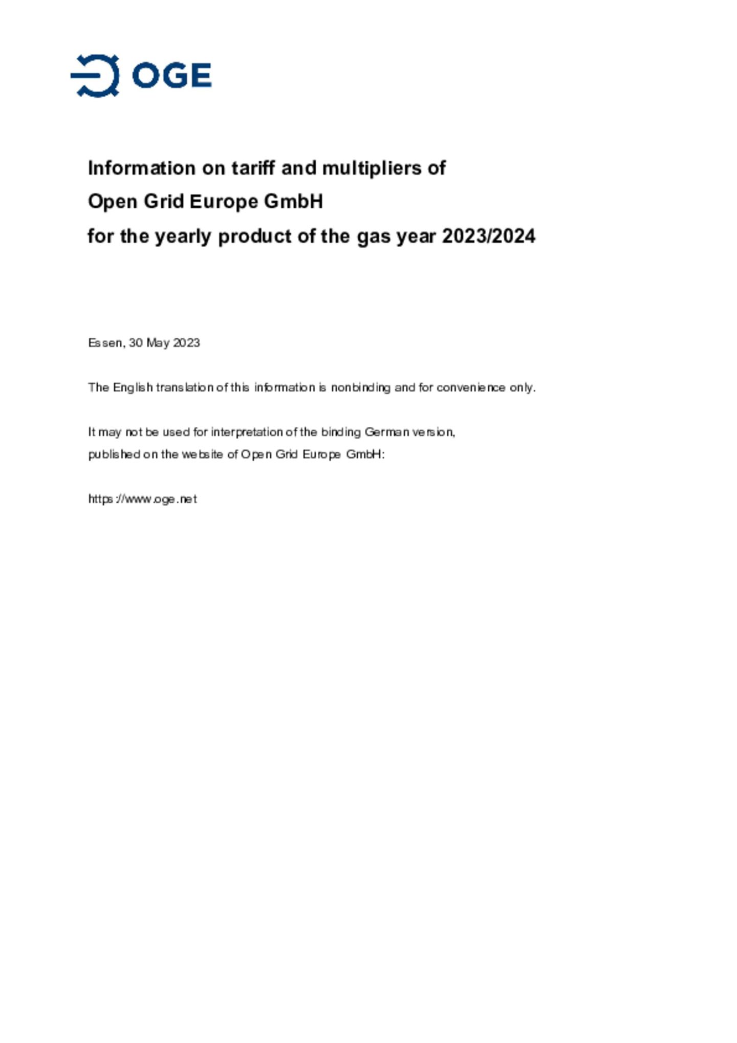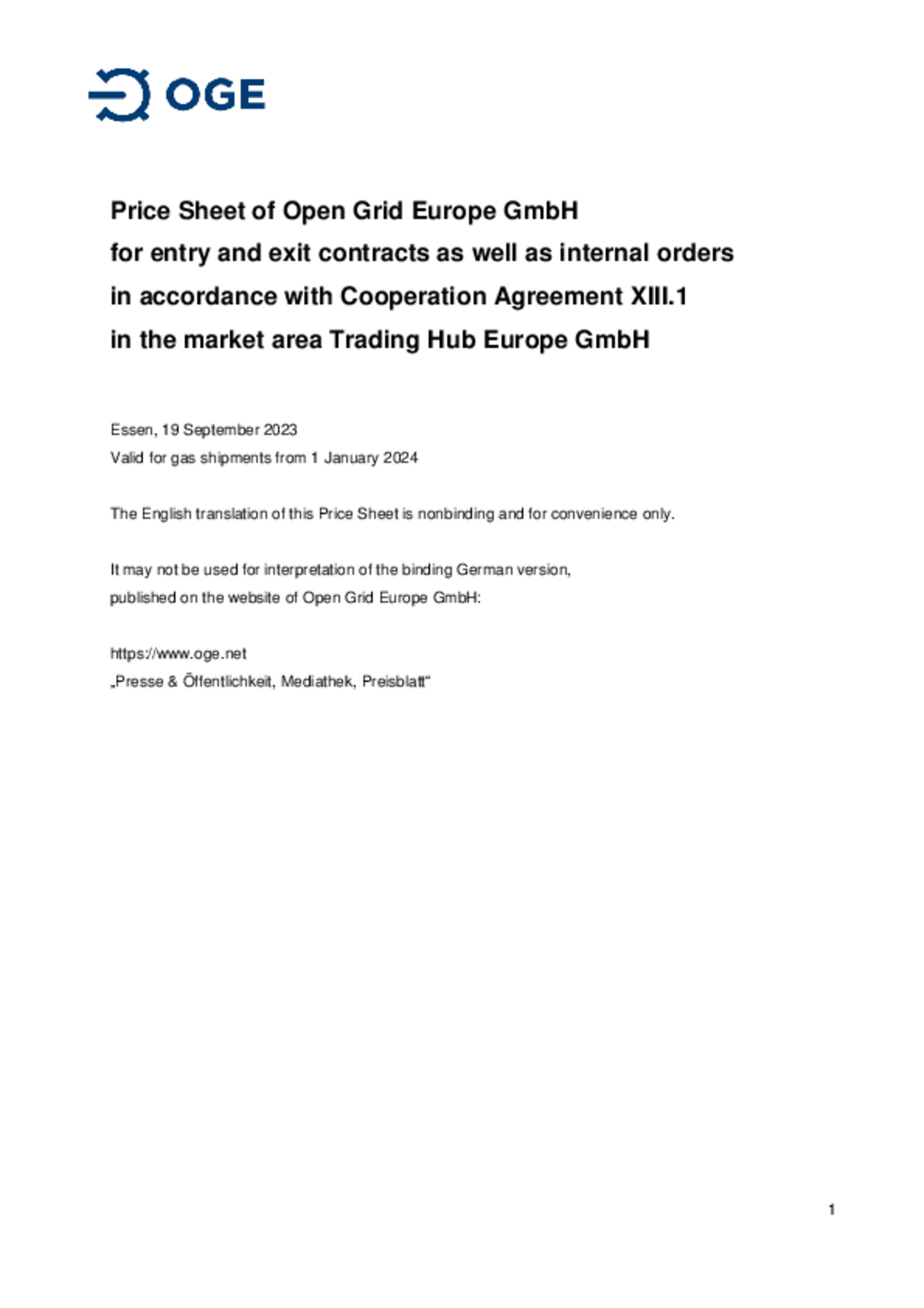 Price Sheet of Open Grid Europe GmbH for entry and exit contracts as well as internal orders in accordance with Cooperation Agreement XIII.1 in the market area Trading Hub Europe GmbH
