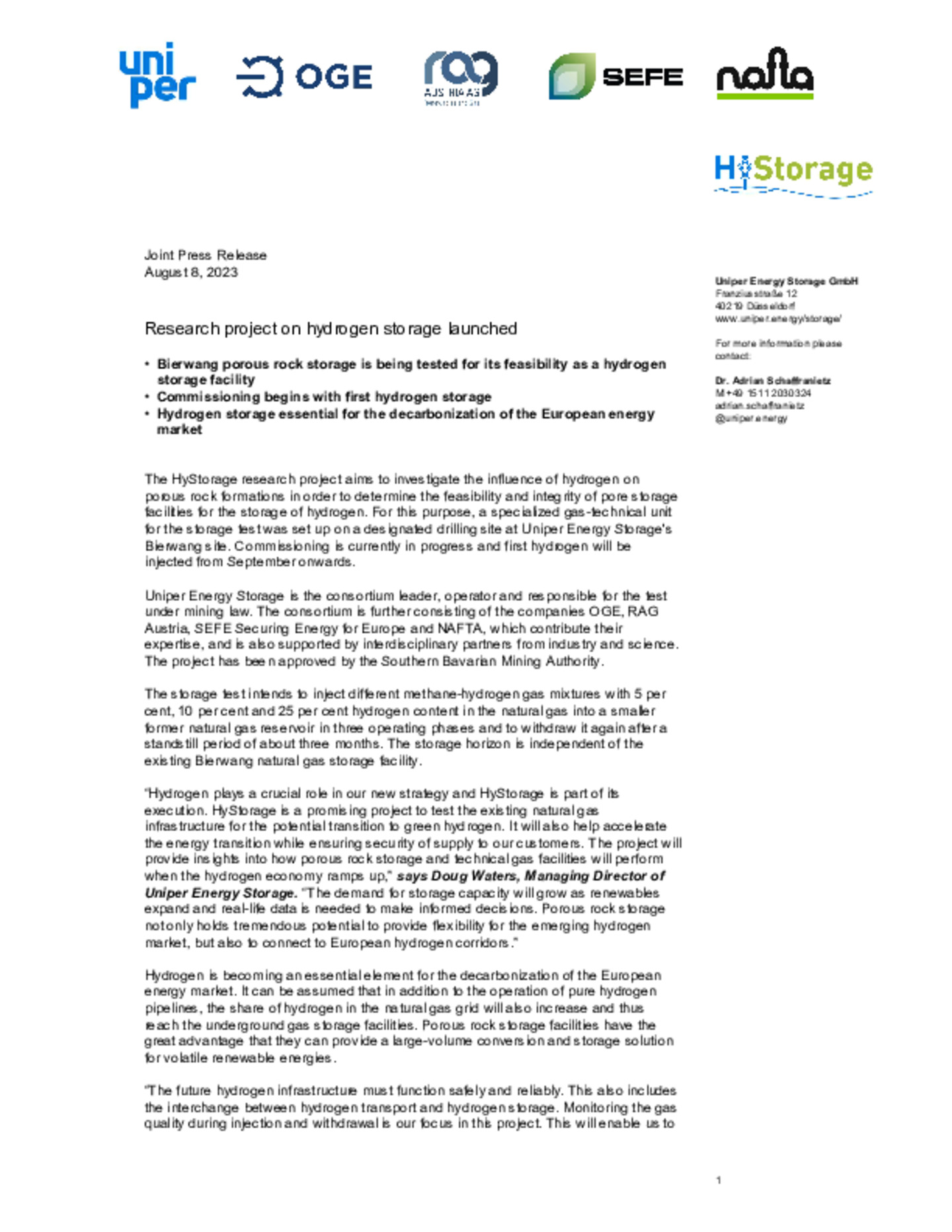 Bierwang porous rock storage is being tested for its feasibility as a hydrogen storage facility. Commissioning begins with first hydrogen storage. Hydrogen storage essential for the decarbonization …of the European energy market.