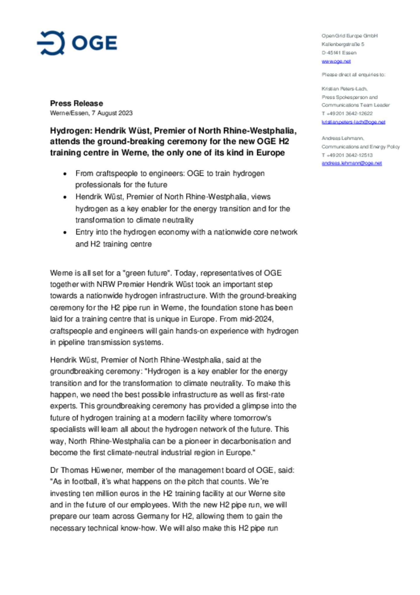 Hydrogen: Hendrik Wüst, Premier of North Rhine-Westphalia, attends the ground-breaking ceremony for the new OGE H2 training centre in Werne, the only one of its kind in Europe. From craftspeople to …engineers: OGE to train hydrogen professionals for the future. Hendrik Wüst, Premier of North Rhine-Westphalia, views hydrogen as a key enabler for the energy transition and for the transformation to climate neutrality. Entry into the hydrogen economy with a nationwide core network and H2 training centre.