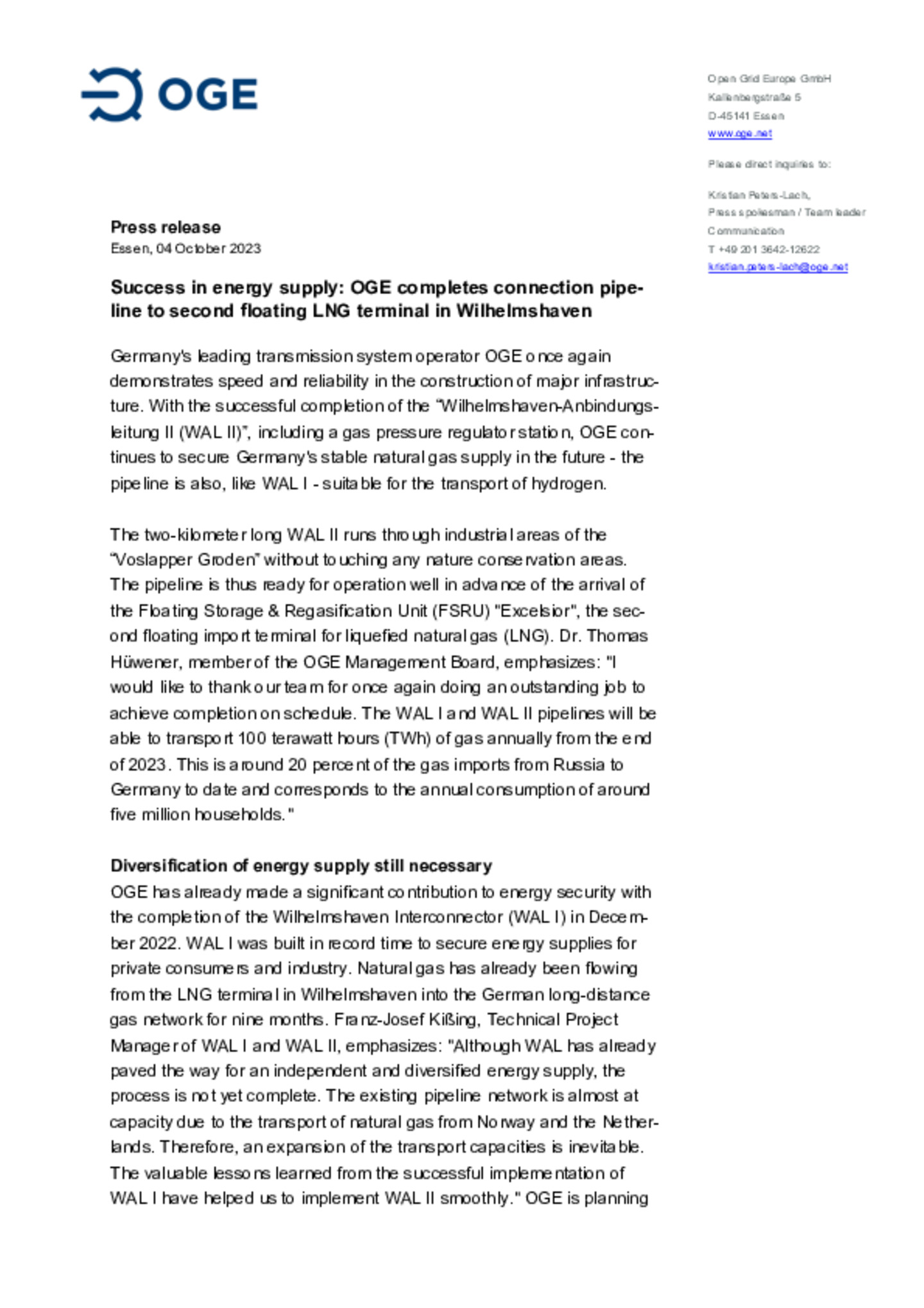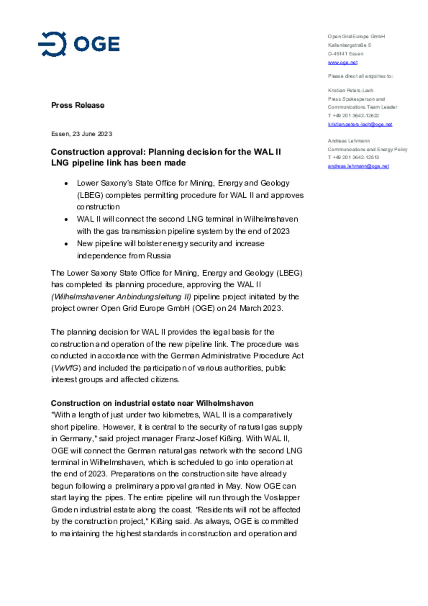 Lower Saxony’s State Office for Mining, Energy and Geology (LBEG) completes permitting procedure for WAL II and approves construction. WAL II will connect the second LNG terminal in Wilhelmshaven … with the gas transmission pipeline system by the end of 2023. New pipeline will bolster energy security and increase independence from Russia.