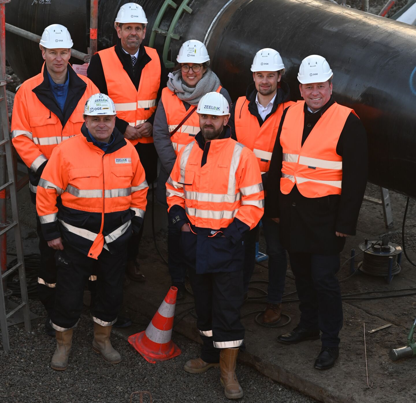 From left: Thomas Hüwener (Member of the Management Board of OGE), Franz-Josef Kissing (Project Manager WAL, OGE), Olaf Lies (Minister for Economic Affairs, Construction, Transport and Digitalisation of the State of Lower Saxony), Anka Dobslaw (State Secretary in the Lower Saxony Ministry for the Environment, Energy and Climate Protection), Christoph Köhler (Commercial Project Manager WAL, OGE), Malte Tammeus (Head of Department, Wittmund District) and Helfried Goetz (Mayor of Friedeburg)
