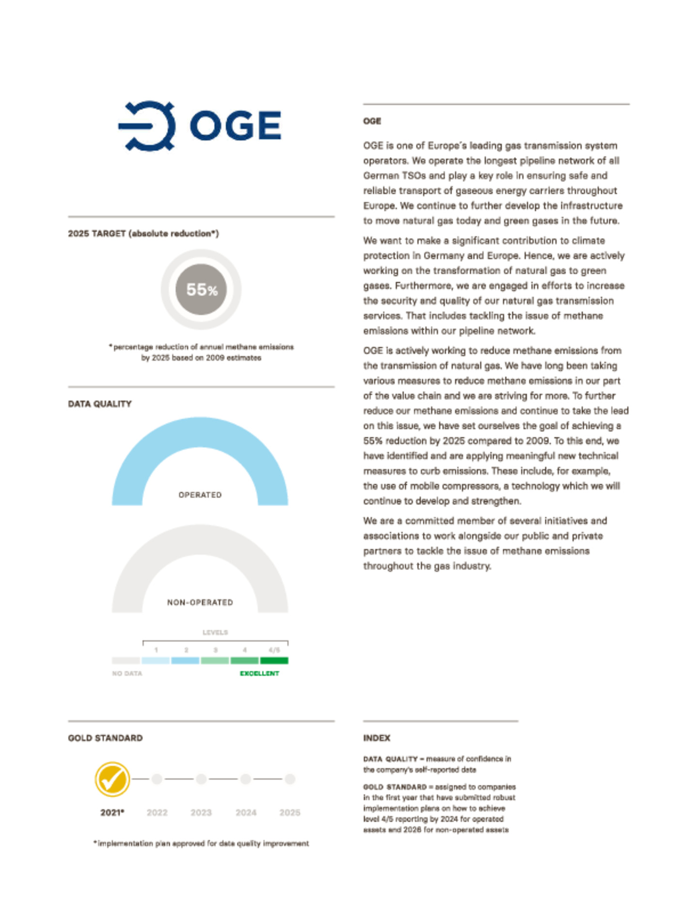 Apart from carbon emissions, methane is one of the key factors in man-made climate change, so it is of the utmost importance to continue reducing methane emissions. These occur, for example, in agriculture, waste management and also during gas transmission, when, for example, unburned natural gas is released into the atmosphere. Methane emissions account for 10% of Europe’s total greenhouse gas (GHG) emissions, and they were almost halved between 1990 and 2017. The oil- and gas industry is responsible for 6,2% of methane emissions (of which 24% occur during gas transmission and storage1), so OGE has a responsibility to society as a whole.